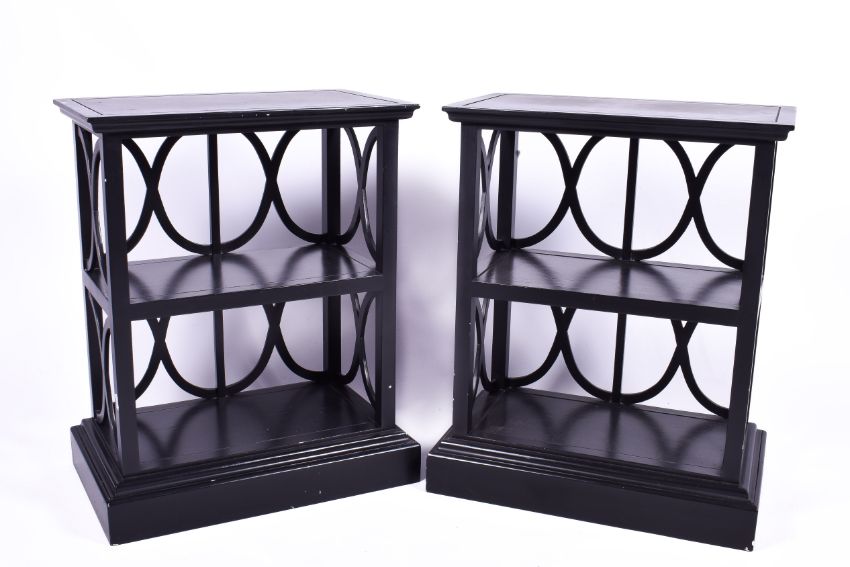 A pair of ebonised 'Perilune' bookcases attributed to OKA. Having 'X' supports and raised on a plinth base. H78cm x W62cm x D37cm