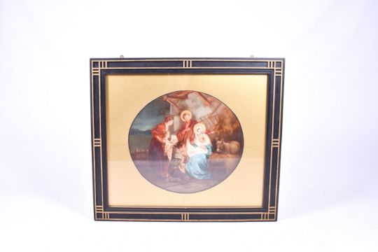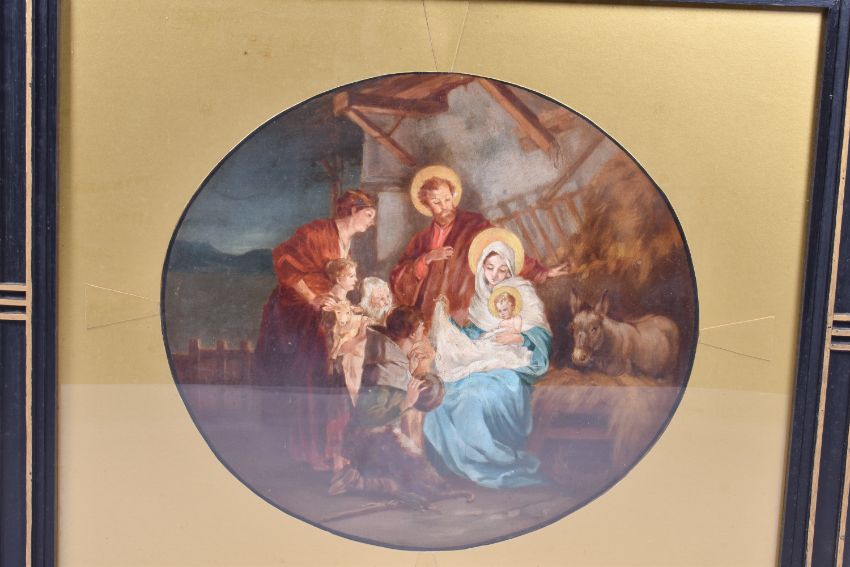 A nativity painting, unsigned. 60cm diameter, framed and glazed W100cm x H87cm