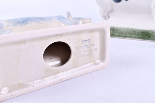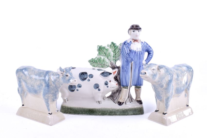 Three modern Rye pottery items. Including a pig farmer, a bull and a cow. Largest H23cm
