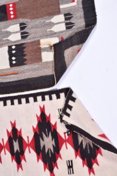 Two assorted kilim rugs. The large on a grey ground depicting people in the centre the other on a cream ground with geometric pattern. Largest 158cm x 101cm