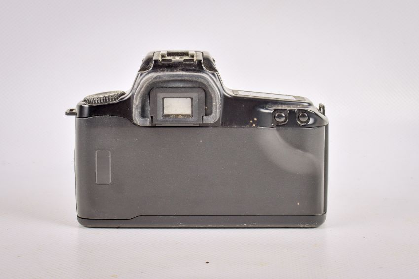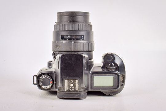 A Canon EOS 1000F N 35mm SLR camera. With a Sigma DL Zoom 35-80mm f4-5.6 lens, optics G. Powers on, shutter working.