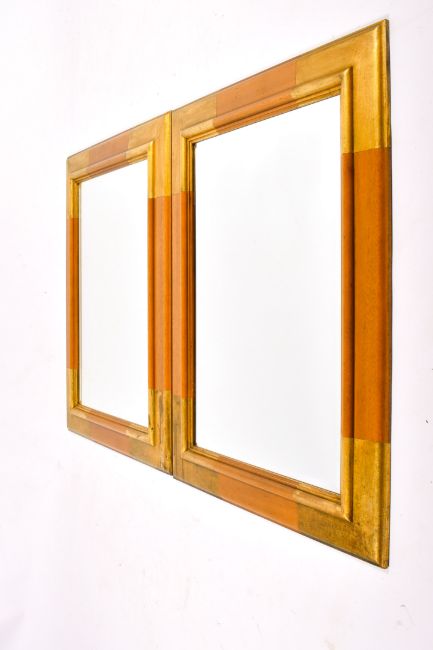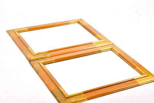 A pair of contemporary bevel edge wall mirrors, framed. Having moulded wooded frames with gilt decoration to each corner. Total 65cm x 86cm