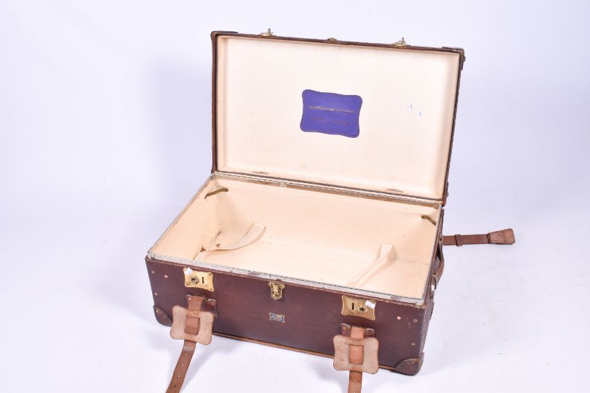 An early 20th century Pukka travelling trunk retailed by Harrods. Having brass locks and catch with leather straps. H35cm x W85cm x D51cm