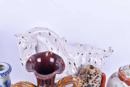 Quantity of Asian ceramics, carved soapstone and a cloisonne dish. Including a Japanese tea pot, etc. Largest H22cm