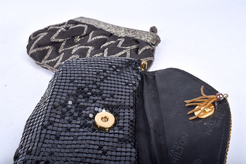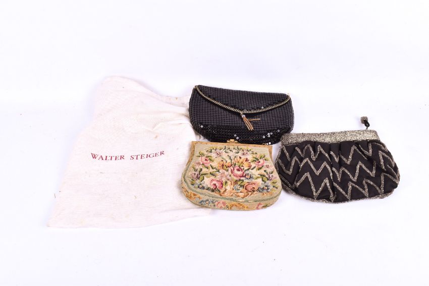 Three womens' vintage evening clutch purses. Including an embroidered and a beaded example, etc.