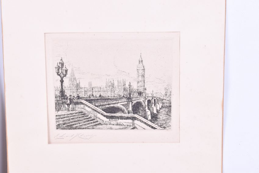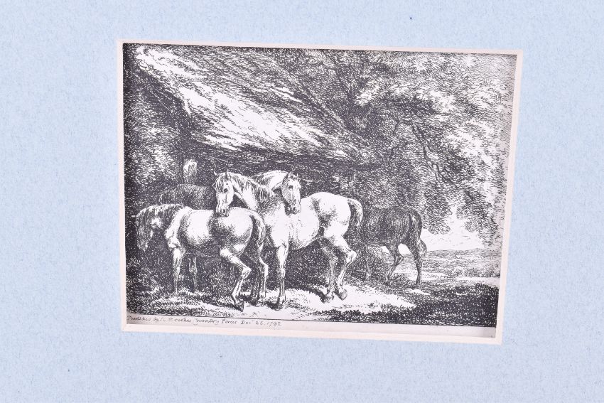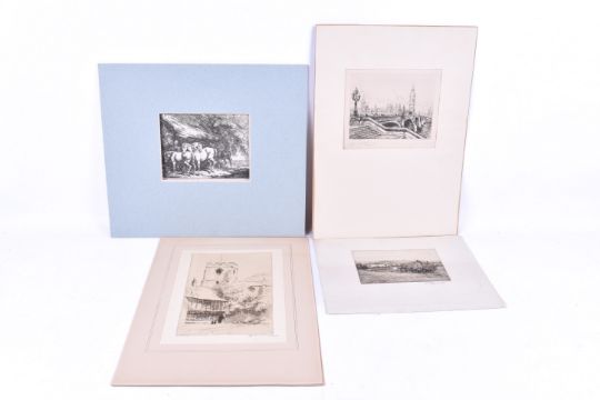 Four 19th and 20th century etchings of horses, city scenes and hay making. Including Samuel Howitt, 'Horses Sheltering'; Edgar Maybery 'Shakespeare's School'; ahaymaking scene, signed lower right; Edward Cherry, Westminster Bridge. All mounted largest mount circa 28cm x 32cm.