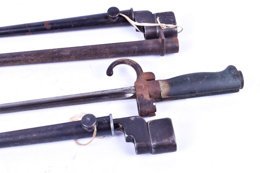 Militaria - a French Lebel bayonet and two British No. 4 spike bayonets. Largest 48cm long, all with scabbards