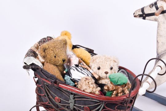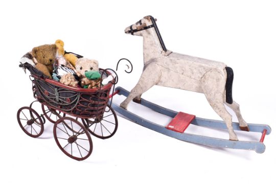 A group of assorted vintage children's toys. Including a wooden rocking horse, a doll carrier stroller with quantity of teddy bears and dolls. Largest H79cm