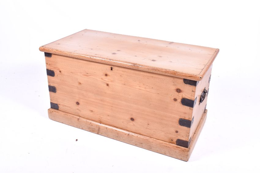 A vintage pine trunk with metal brackets and handles. W92cm x H49cm x D46cm