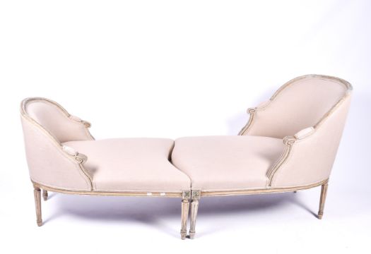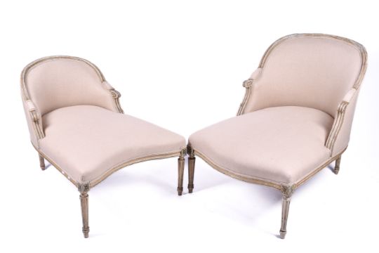 A pair French Duchesse Brisee chairs. Painted frames, upholstered in linen, raised on fluted tapering supports. H94cm x W74cm x D110cm