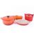 Four Le Creuset pots. An Orange casserole pot with lid (chipped handle), 25cm diameter, A red pot with lid, 20cm diameter, an orange casserole dish, L34cm and an orange terrine dish with lid L31cm