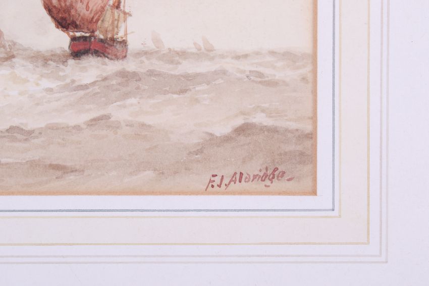Frederick James Aldrige (1850-1933), watercolour, 'Entering Harbour in a Swell'. Signed lower right, 14cm x 24.5cm, framed and glazed 34cm x 44cm.