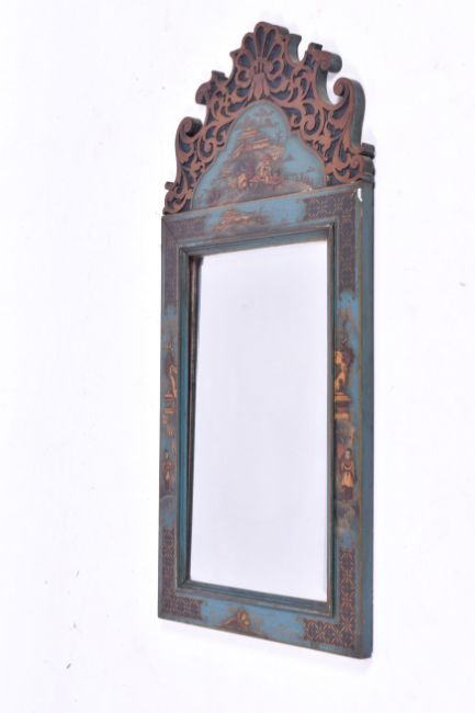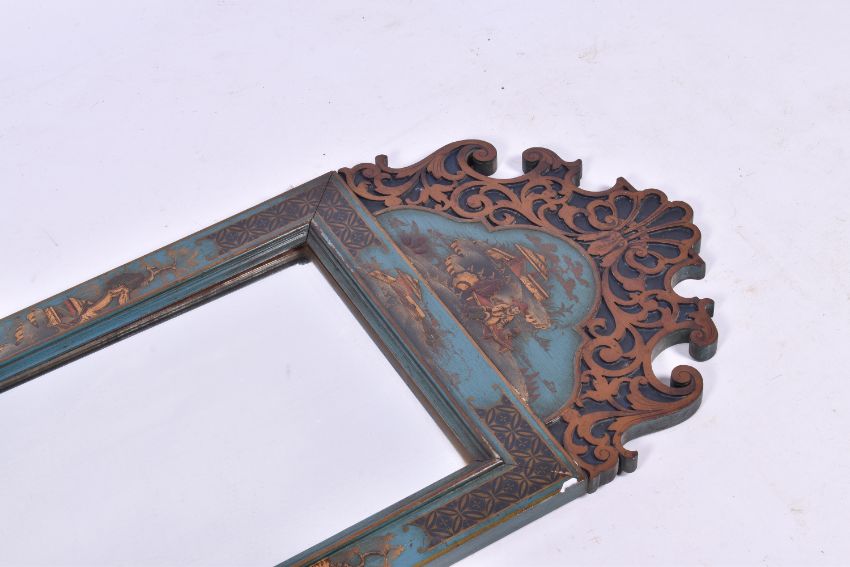 A 20th century chinoiserie style wall mirror. Having a blind fretwork crest with a figure in the landscape beneath, bevelled edge glass. Total 43cm x 86cm