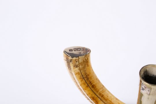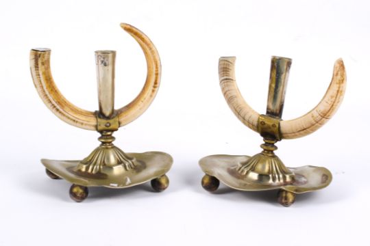 A pair of silver hallmarked mounted boar's tusks candlesticks with plated stands. H10cm