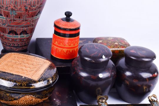 Collection of lacquer decorated and papier mache wares. Including vases, boxes, vessels and playing card storage box. Largest H36cm