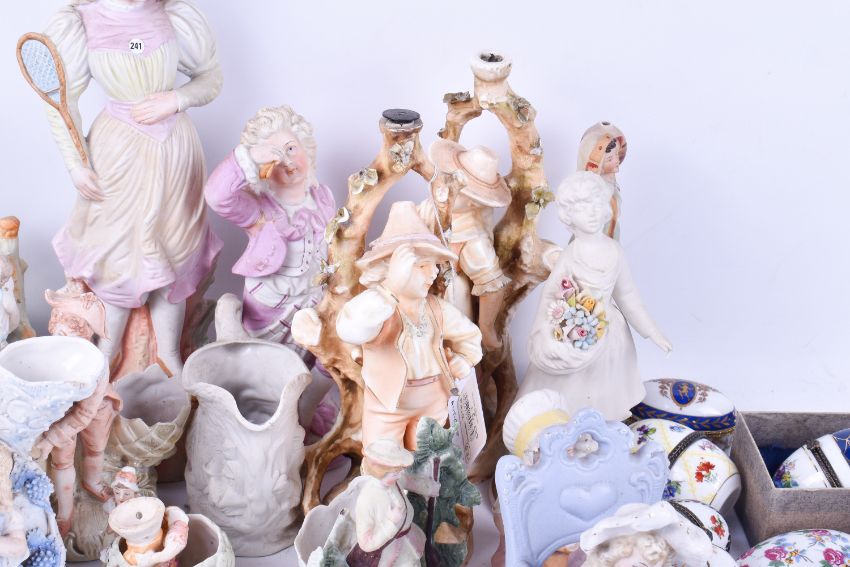 A large quantity of bisque porcelain figures and egg jewellery boxes. Including various period characters including musicians and girl with tennis racket, Largest H32cm