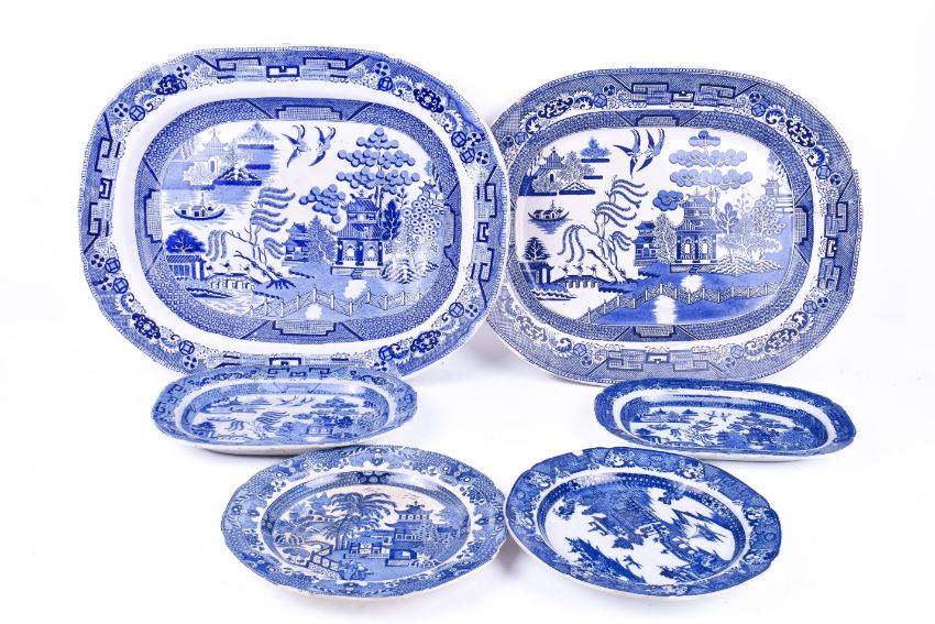 A quantity of blue & white meat plates with willow pattern. Largest 48cm