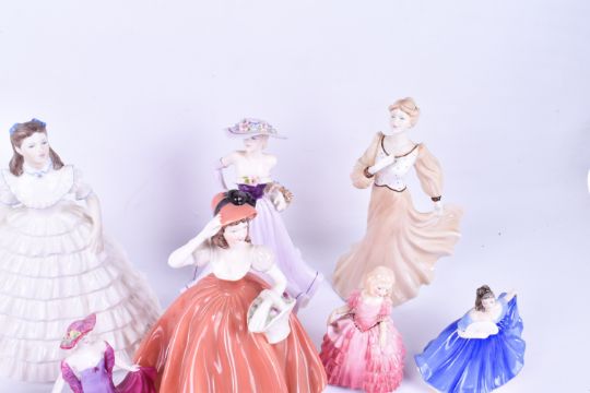 A collection of nine Coalport and five Royal Doulton ladies. For Coalport, Ladies Of Fashion; Melanie, Amanda, Demetria, The Ball, Flora, Antonia, Andrea, Cassie and Tracy. For Royal Doulton; Veronica (HN1517), Lynsey (HN3043), Good Friend (HN5578), Rose (HN1368) and Elaine (HN3214).
