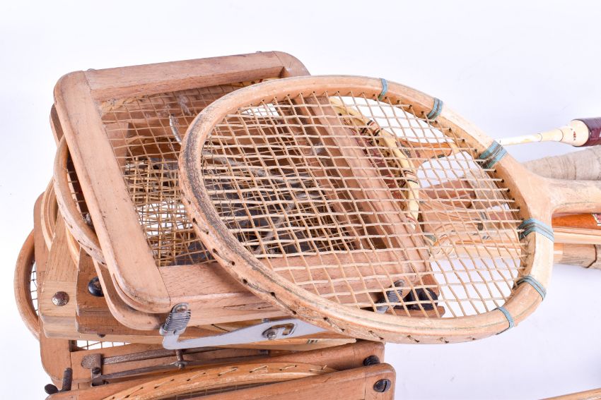 A collection of early wooden squash, tennis and badminton racquets. Most with a press.