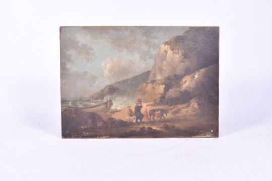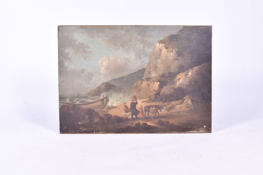 19th Century on canvas - beach scene, fishing-folk transporting the catch. unframed. 85cm x 60cm