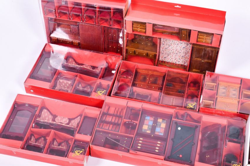 A quantity of vintage dolls house furniture, boxed. Mostly Victorian and rustic dining, lounge and bedroom furniture.