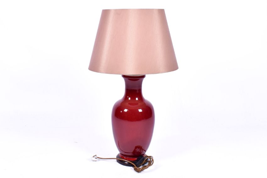 A contemporary Chinese sang de boeuf style vase table lamp. Raised on a turned wooden base. Height from rim of vase including base 48cm.