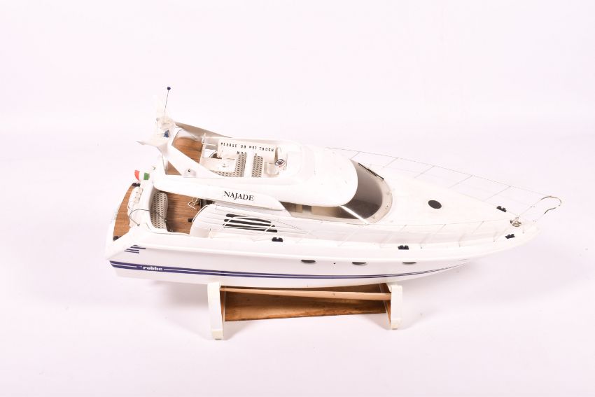 A modern radio control model luxury motor yacht 'Najade' by Robbe on stand. 93cm long
