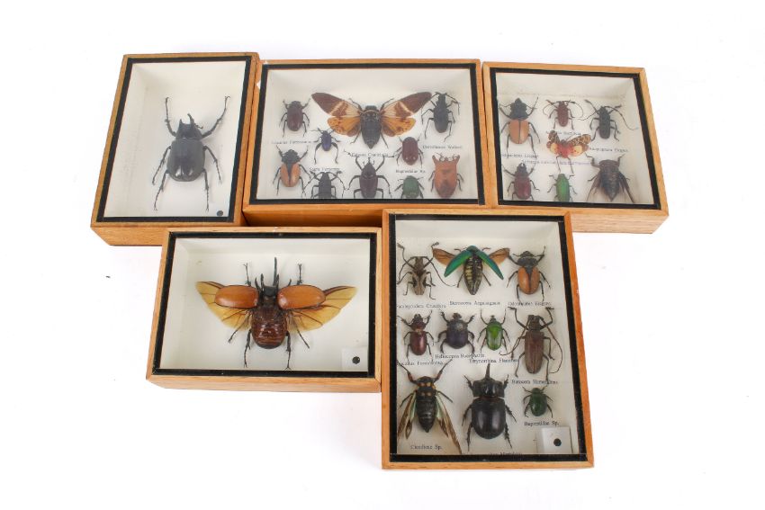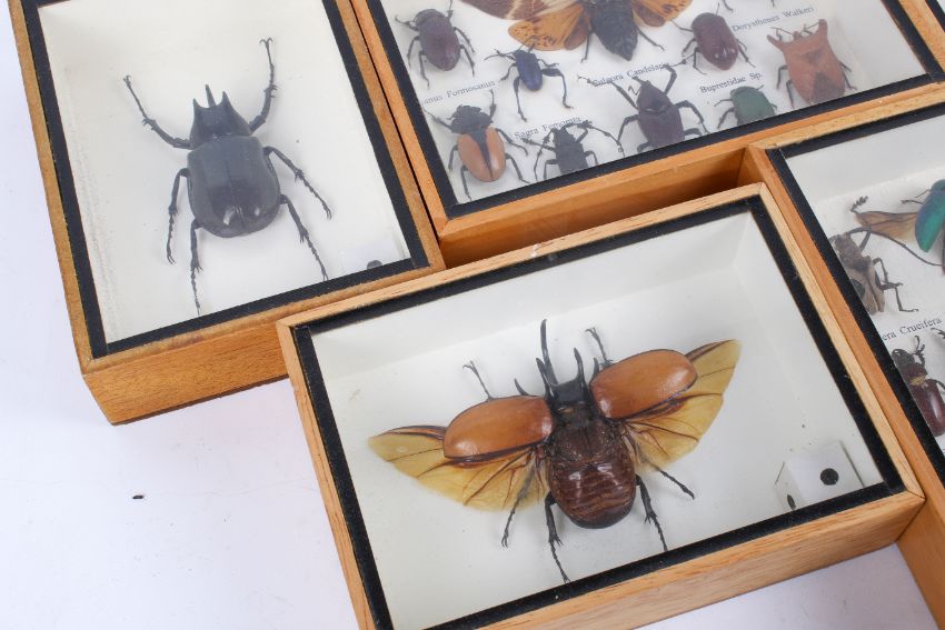 Five boxed beetle sepcimen sets. Including Eupatorus Gracilicornis, this measuring 14cm wide, Chalcosoma Atlas, Sternocera Aeguisignata, etc.