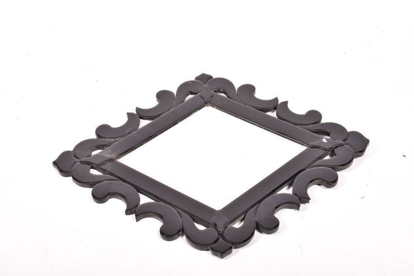 A contemporary Venetian style diamond shaped wall mirror with black glass frame (af). Total H86cm x 66cm