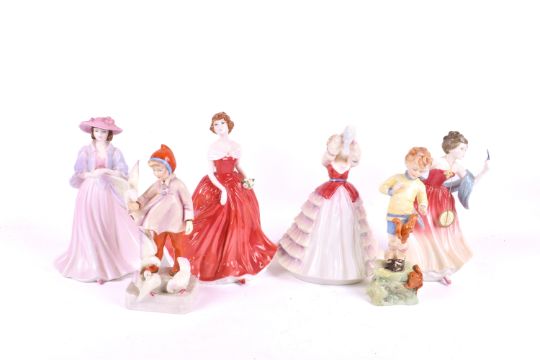 A group of six assorted porcelain figures. Including Royal Doulton, Coalport and other figures of ladies and two Royal Worcester children - October and November. Largest H21cm