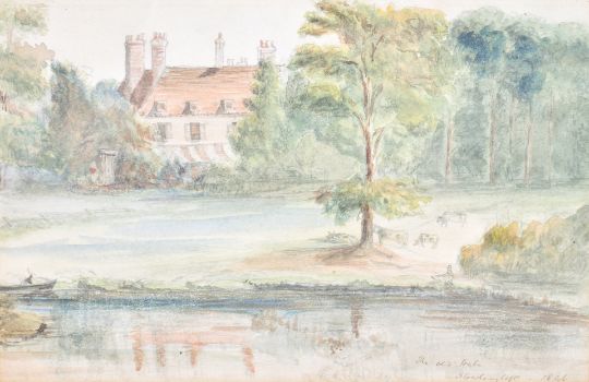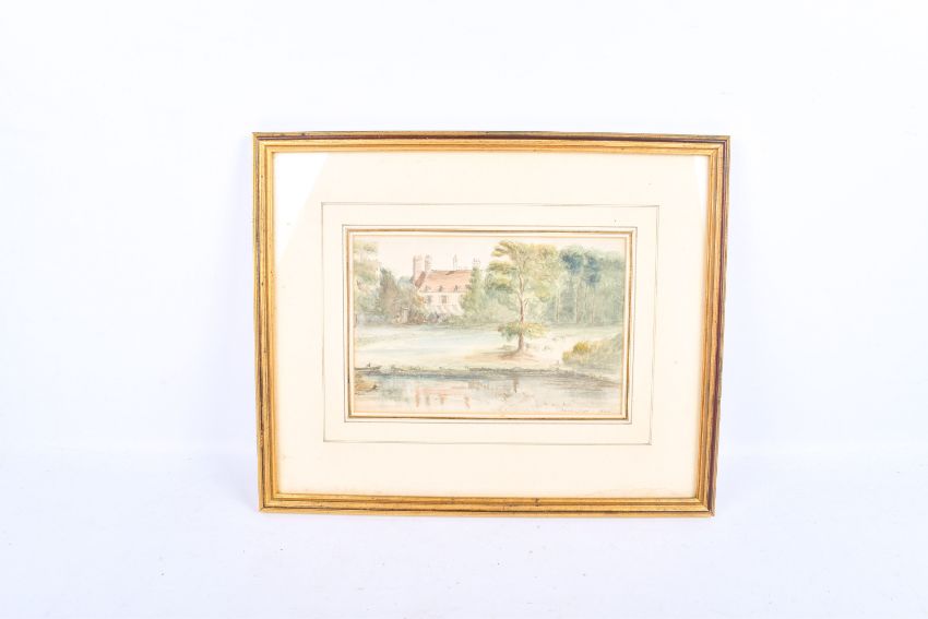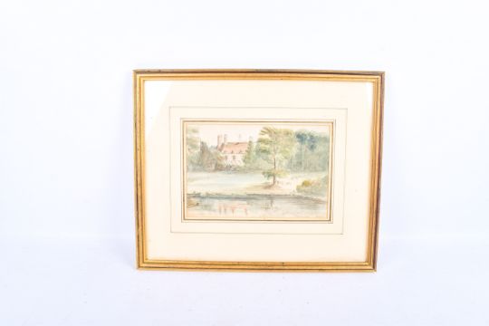 A watercolour of house on lake. Indistinct signature lower right dated 1846, 22cm x 14.5cm, framed and glazed, 38cm x 31cm