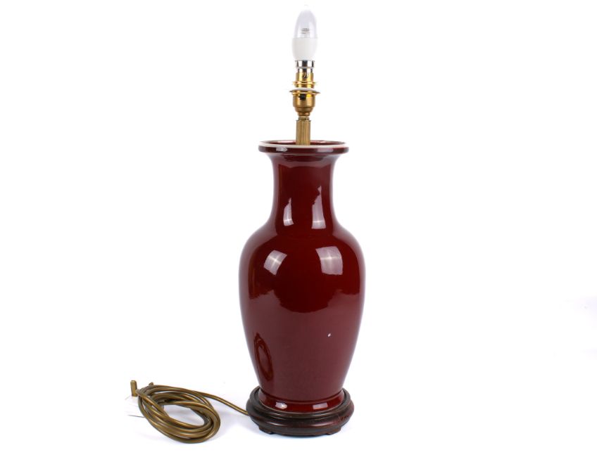 A contemporary Chinese sang de boeuf vase table lamp. Raised on a turned wooden base. Height from rim of vase including base 38.5cm.