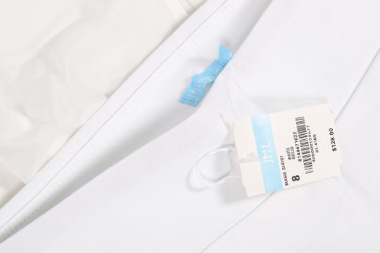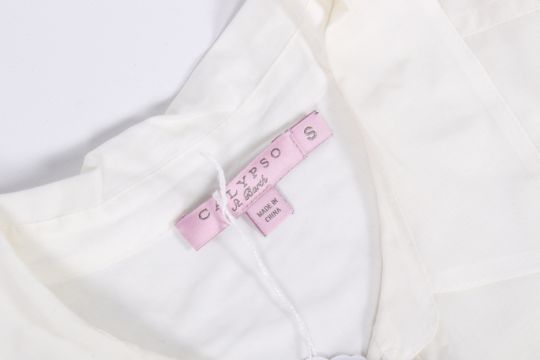A collection of ladies designer and high end clothing. Comprising a Tomas Maier nude silk dress, size 40, a Calypso white cotton and silk blouse, size S, a Manuel Canovas white cotton blouse, size S, two pairs of Theory white shorts, size 6 and a pair of J. Mc Laughlin white shorts, size 8, with the original tag.