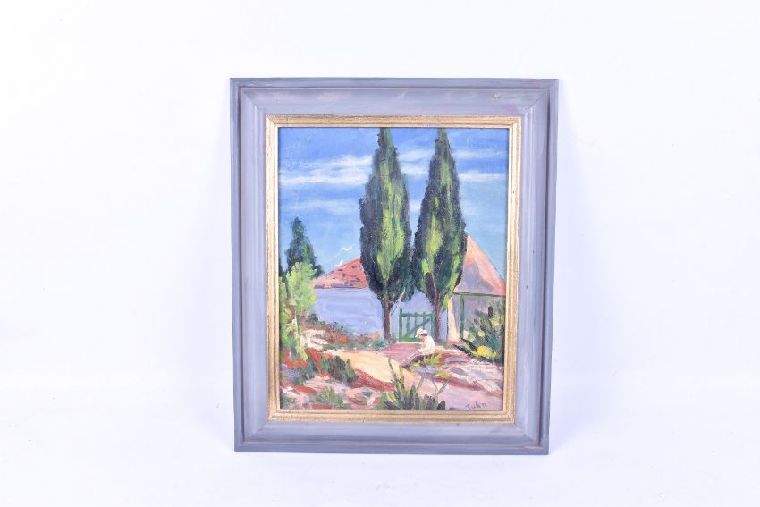 Oil on board - Villa in Provence. Signed 'John' lower right, 23cm x 29cm, framed, 33cm x 39cm