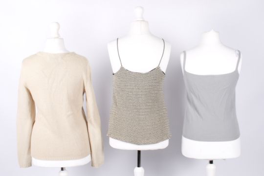 Three pieces of ladies designer knitwear. Comprising a ba&sh camisole woven in cream, gold and black threads, with pockes and a black lining, size 1, a Malo grey cashmere camisole, L53cm x chest W44cm and a Blumarine blush cardigan with embellished buttons, L60cm x chest W45cm.