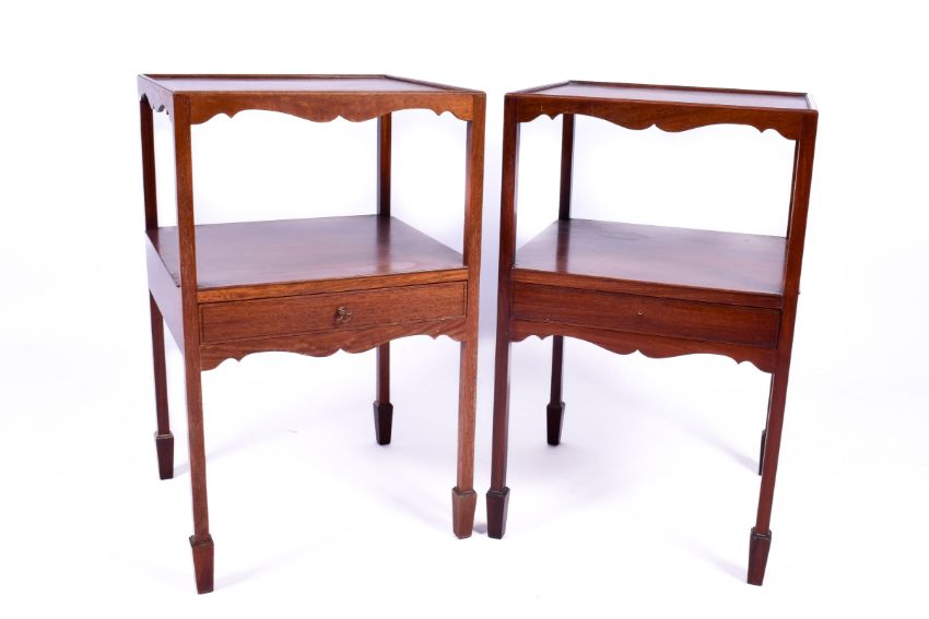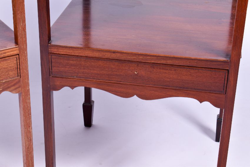 A pair of 20th century Georgian style mahogany nightstands. Having an open shelf with frieze drawer, raised on square supports with spade feet. H75cm x W45cm x D43cm