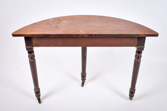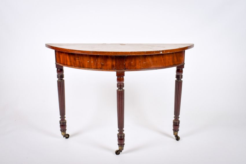 A Victorian mahogany demi-lune top console table. Raised on fluted tapering supports terminating with casters. H72cm x W104cm x D34cm