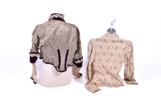 A Victorian ladies embroidered fitted jacket and one other jacket, on hanger mannequins. Mannequin H76cm
