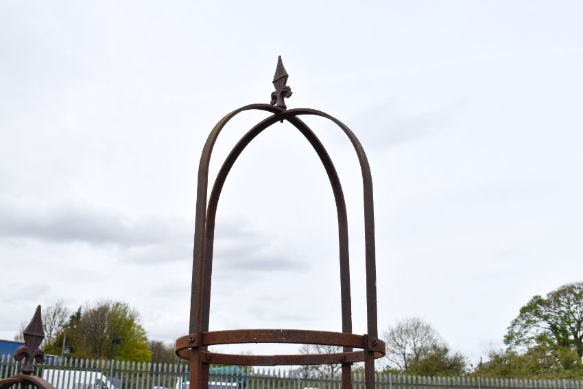 Two assorted metal garden plant supports with finial detail to the top. Largest circa H240cm