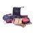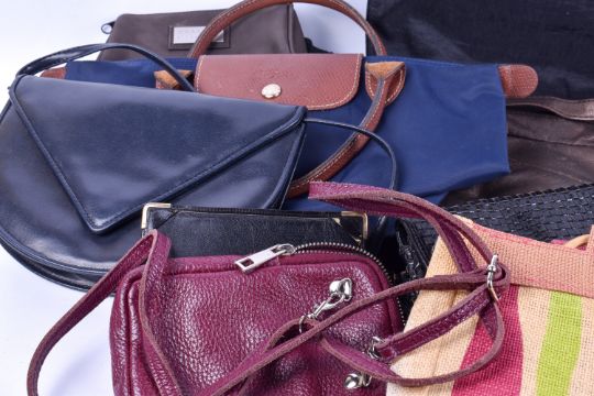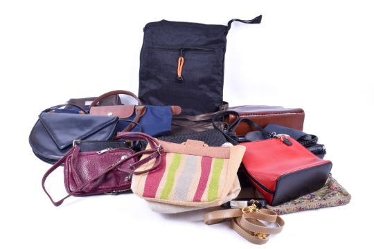 A collection of handbags. Including a vintage Italian faux alligator skin clutch, a Vera Pelle red leather shoulder bag, a Skypak travel bag set, a Longines folding handbag, etc.