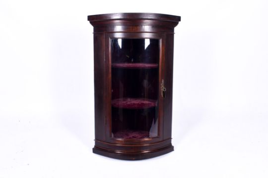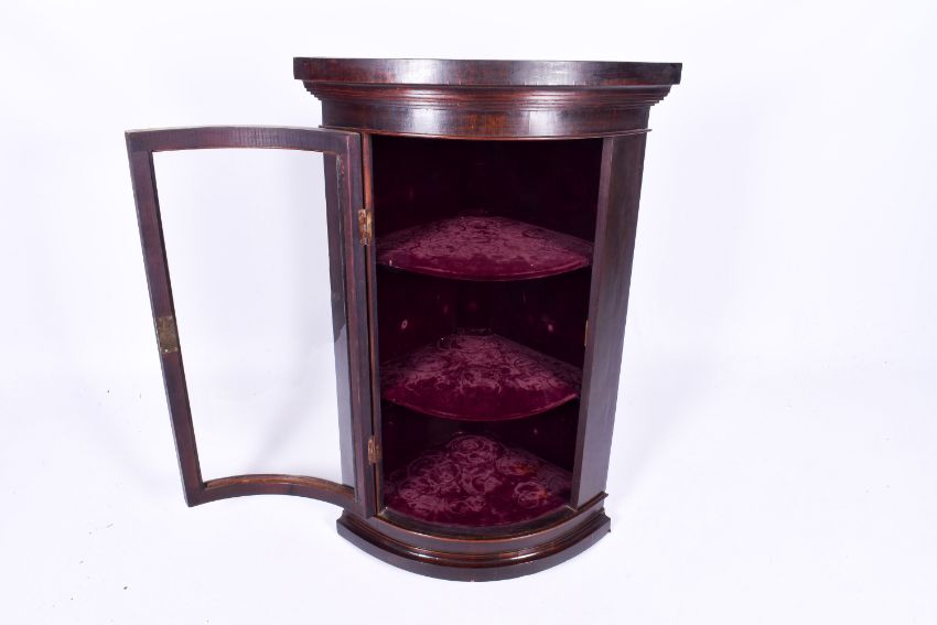 A Georgian curved glazed corner cabinet. Door opening to reveal two fixed shelves. H100cm x W66cm x D46cm