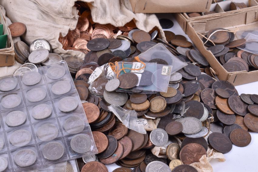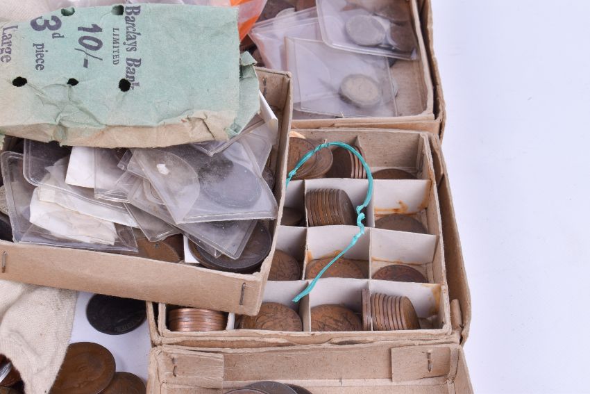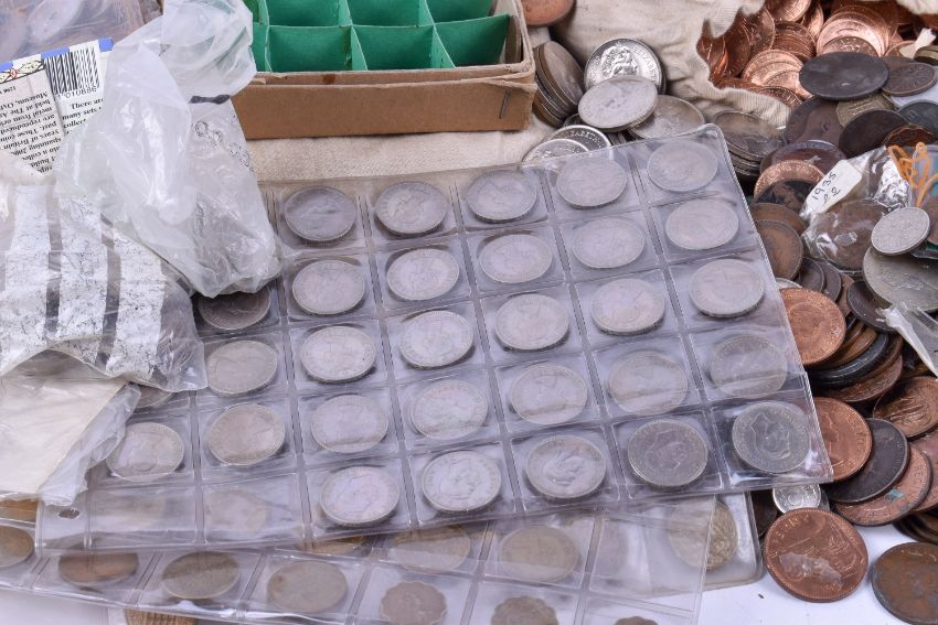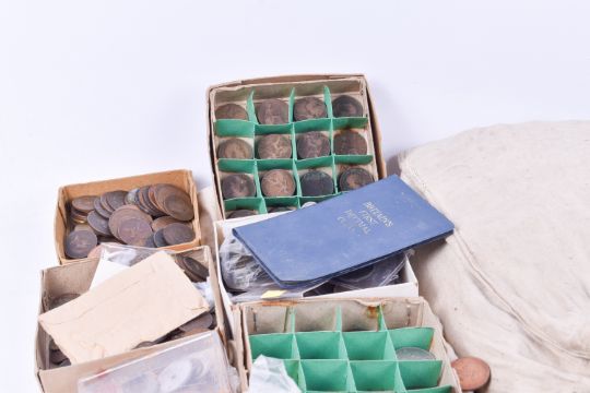Large quantity of base metal coinage, in cloth bags and loose