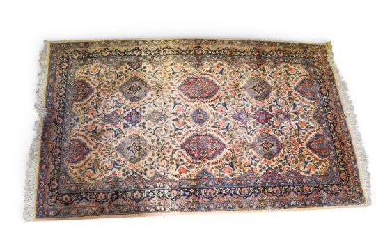 A 19th Century Persian cream and blue ground rug. With blue and red decorative patterns. L250cm (excluding tassles) x W151cm