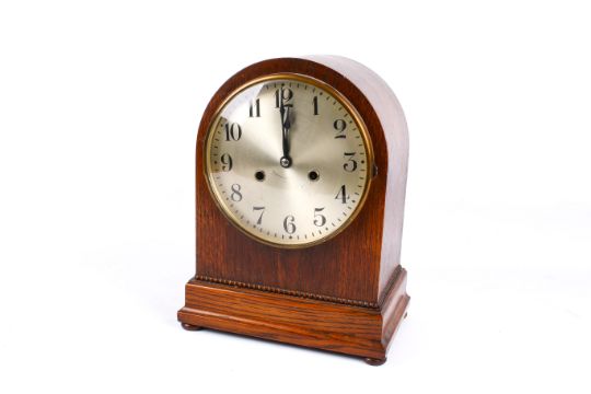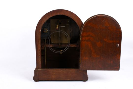 An early 20th century oak cased arched top mantel clock. Having Arabic numerals on a silvered dial, striking to a gong, key and pendulum present. H31cm.
