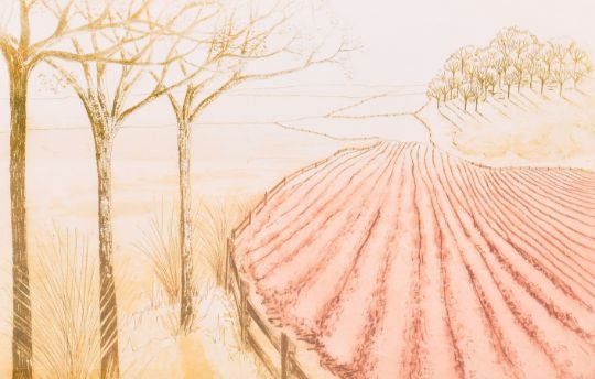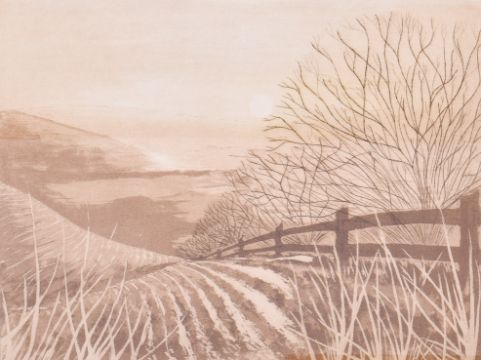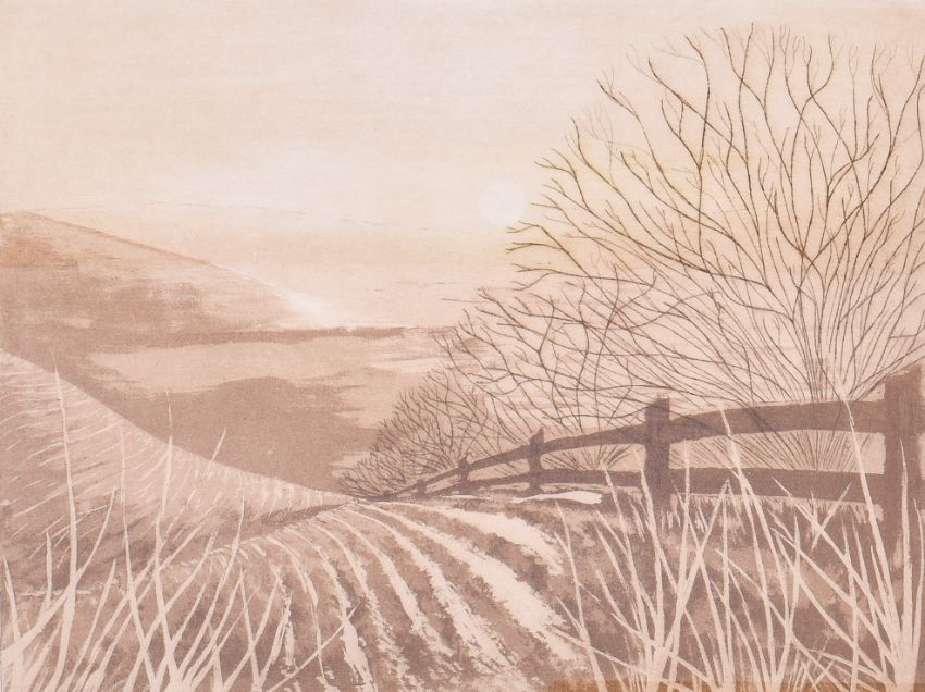 Two limited edition colour etchings by Julie Young and another in monachrome (unsigned), all depicting landscape scenes.. Largest in green, yellow and orange, 3/75. Smallest in brown 6/75. Both signed lower right. Largest W47cm x H32cm, framed & glazed W66cm X H52cm.