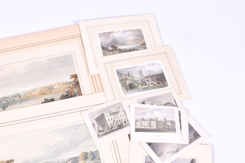 Fourteen 19th century and later coloured prints. Including two large examples after C.W. Fielding of Longleat and Blenheim Palace, these mounted size 40cm x 49cm; St. Michael's Mount, Cornwall, T. Allom; various buildings in Wiltshire, etc.