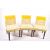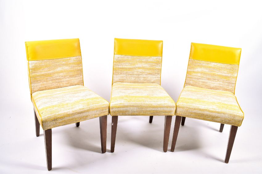 A set of three contemporary dining chairs. Upholstered in yellow leather and yellow and grey fabric, raised on tapered supports, H83cm.