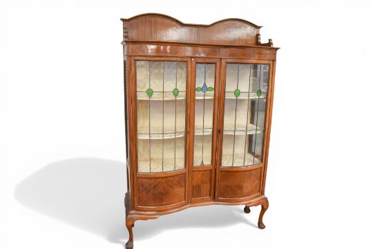 1920s mahogany display cabinet, fitted two bowed leaded glass doors, raised on cabriole supports. H180cm x W122cm x D37cm