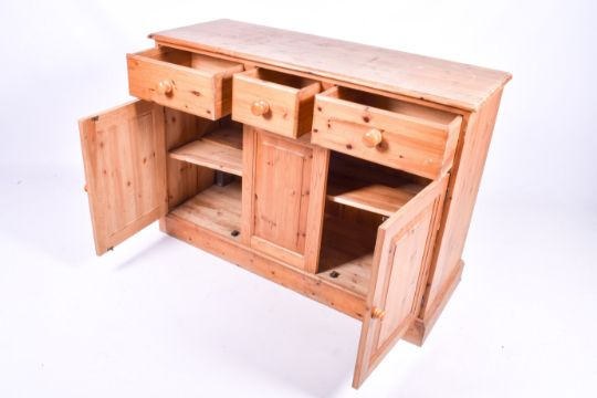 A 20th Century farmhouse style pine sideboard unit. Three drawers over cupboard section with two doors. W122cm x H86cm x D45cm