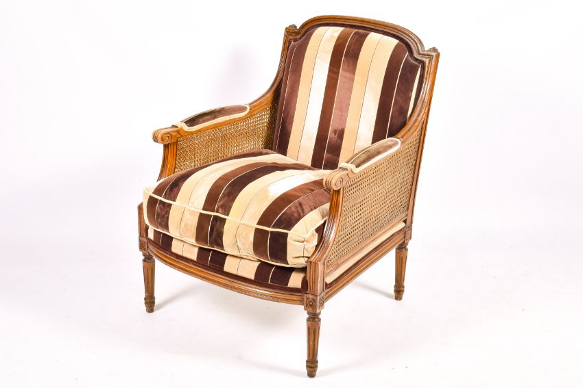 A French Bergere mahogany style armchair with stripped brown upholstery. Having scroll arms and raised on turned tapering fluted supports. H92cm x W69cm x D70cm